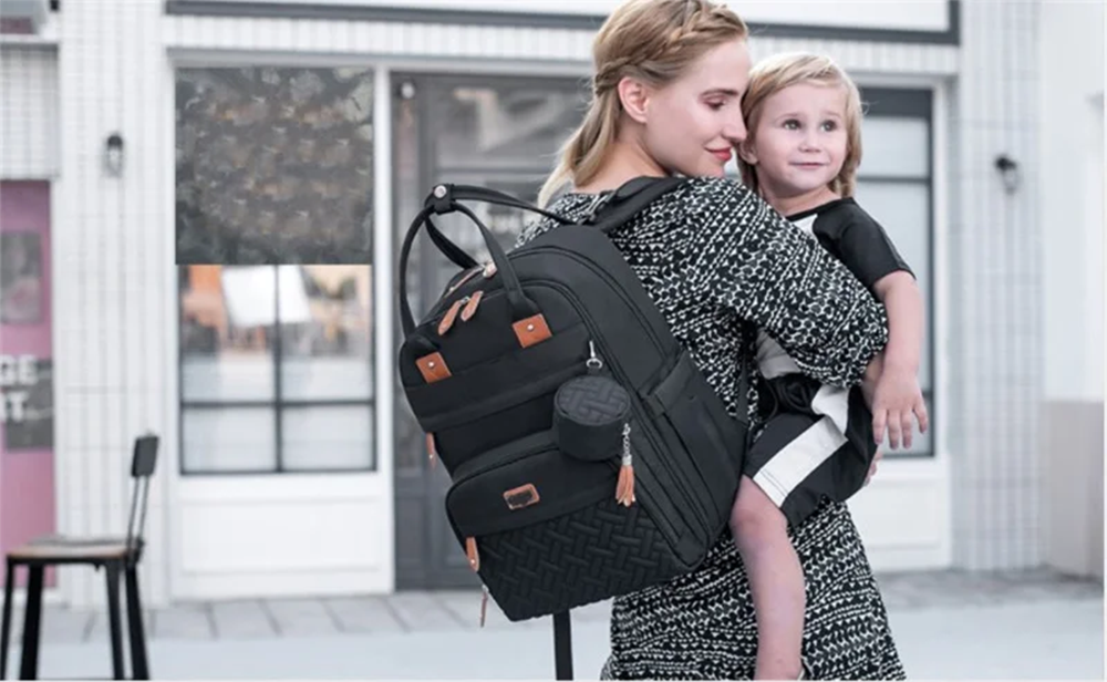 بتصميم أنيق ومريح يمكن حملها على كلا الكتفين كما يمكن تعليقها على عربة الأطفال. مصنوعة من مواد عالية الجودة من أجل المتانة والاستخدام طويل الأمد.